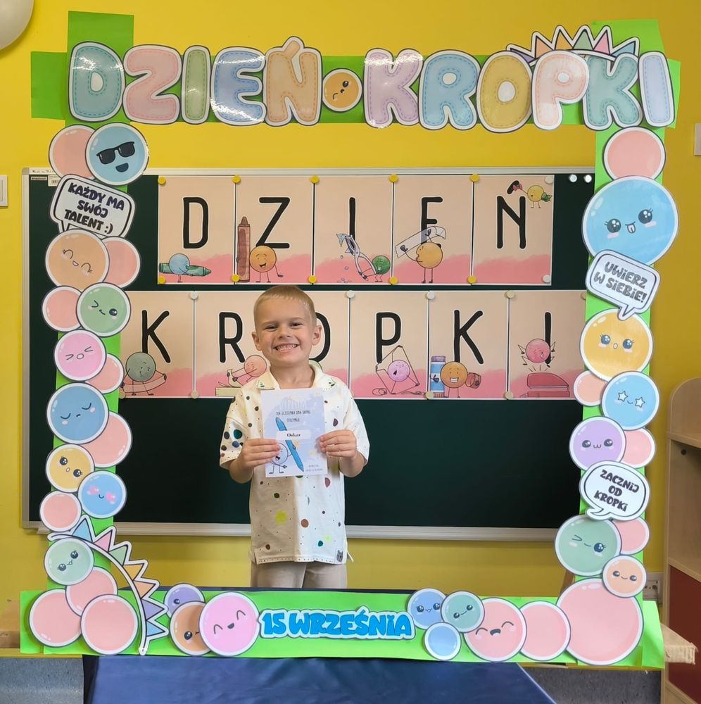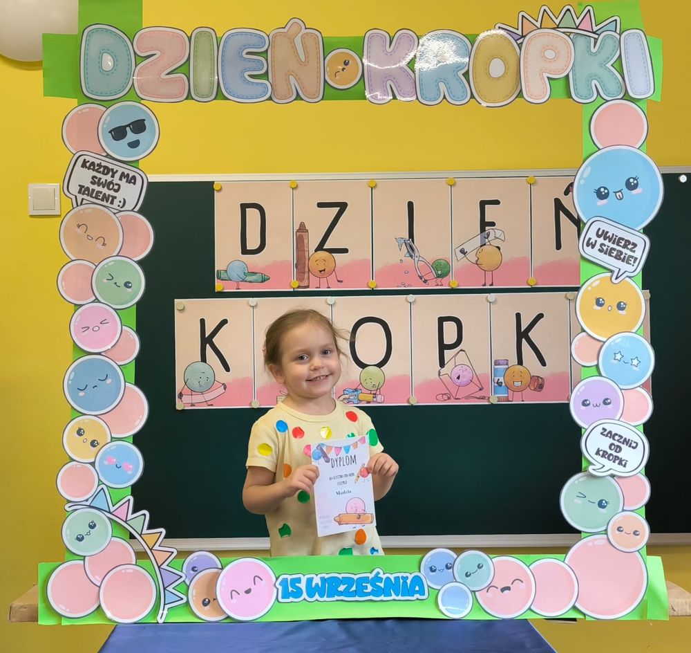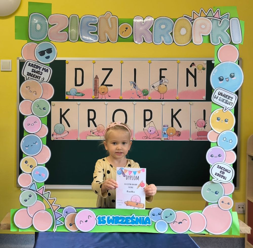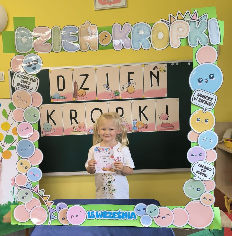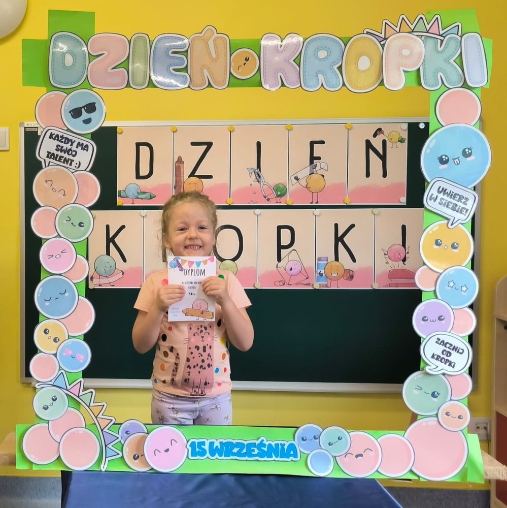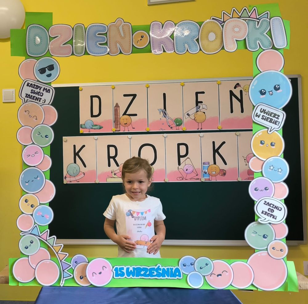 16 września dzieci z grupy Biedronek obchodziły Dzień Kropki. W trakcie zajęć poznały historię dziewczynki, która odkryła swój talent i odzyskała wiarę we własne możliwości. Na dzieci czekały różnorodne zadania: musiały odnaleźć cień pasujący do ilustracji oraz ćwiczyć swoją spostrzegawczość. Biedronki utrwalały także nazwy kolorów podczas wspólnej pracy plastycznej. Dodatkowo rozwijały swoją sprawność ruchową podczas zabawy z kolorowymi krążkami. Z wszystkimi zadaniami poradziły sobie doskonale. Na zakończenie zajęć, przedszkolaki miały wykonane zdjęcia oraz otrzymały pamiątkowy dyplom.