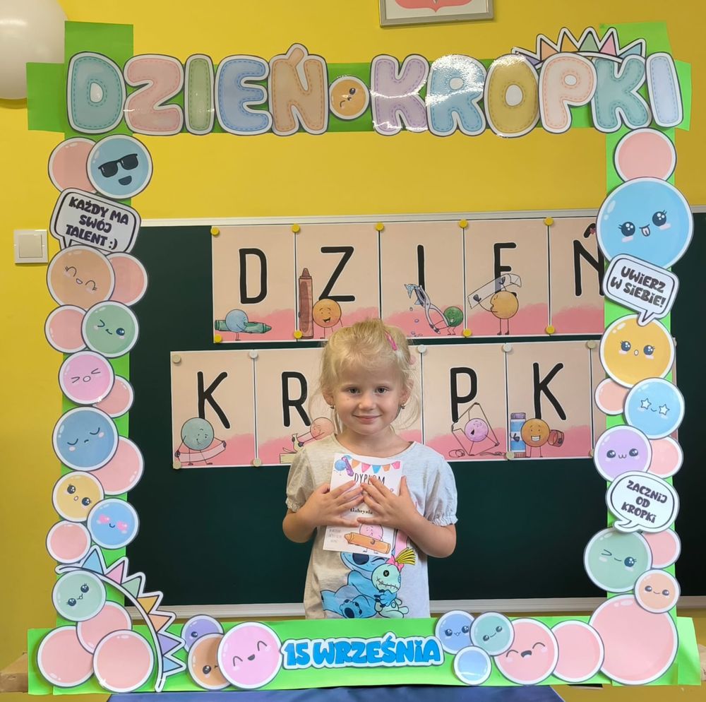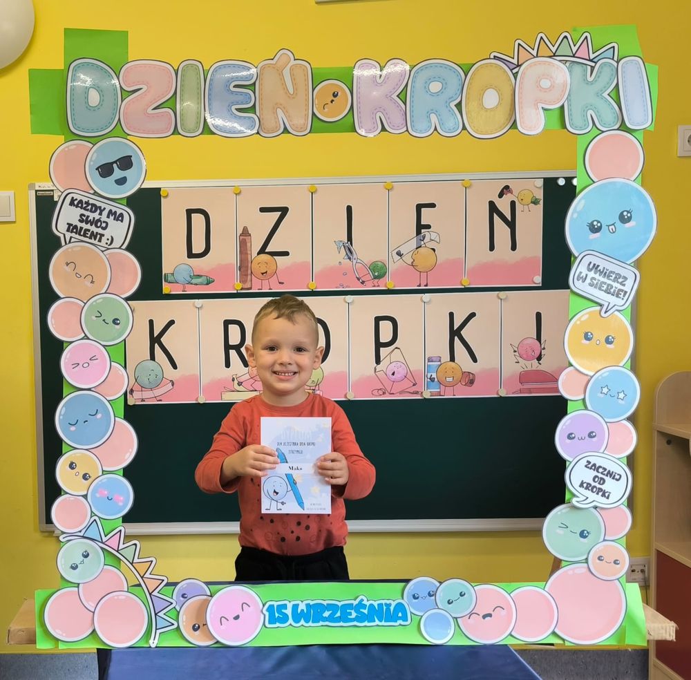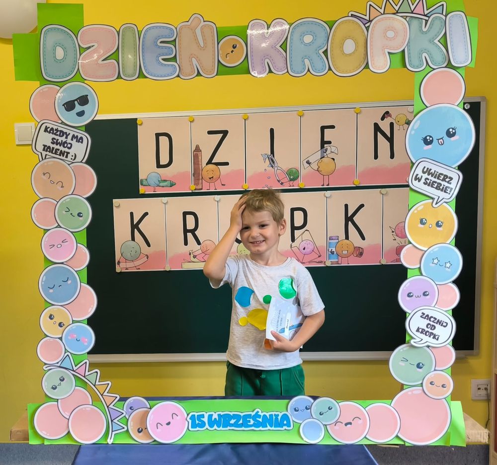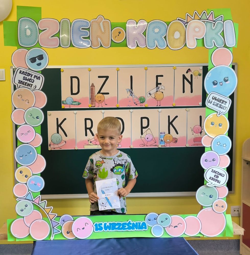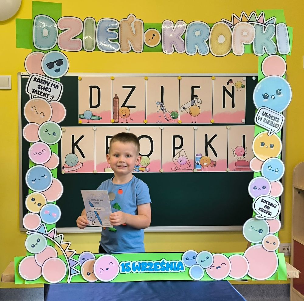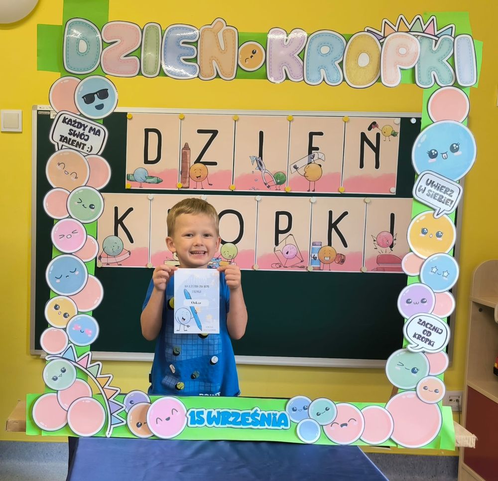 16 września dzieci z grupy Biedronek obchodziły Dzień Kropki. W trakcie zajęć poznały historię dziewczynki, która odkryła swój talent i odzyskała wiarę we własne możliwości. Na dzieci czekały różnorodne zadania: musiały odnaleźć cień pasujący do ilustracji oraz ćwiczyć swoją spostrzegawczość. Biedronki utrwalały także nazwy kolorów podczas wspólnej pracy plastycznej. Dodatkowo rozwijały swoją sprawność ruchową podczas zabawy z kolorowymi krążkami. Z wszystkimi zadaniami poradziły sobie doskonale. Na zakończenie zajęć, przedszkolaki miały wykonane zdjęcia oraz otrzymały pamiątkowy dyplom.
