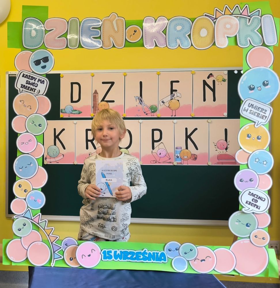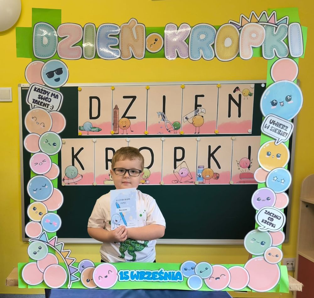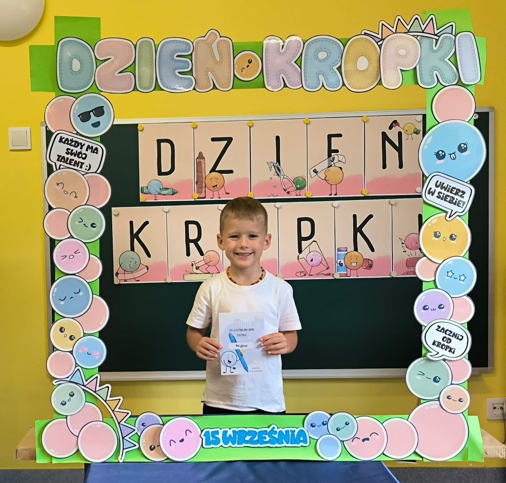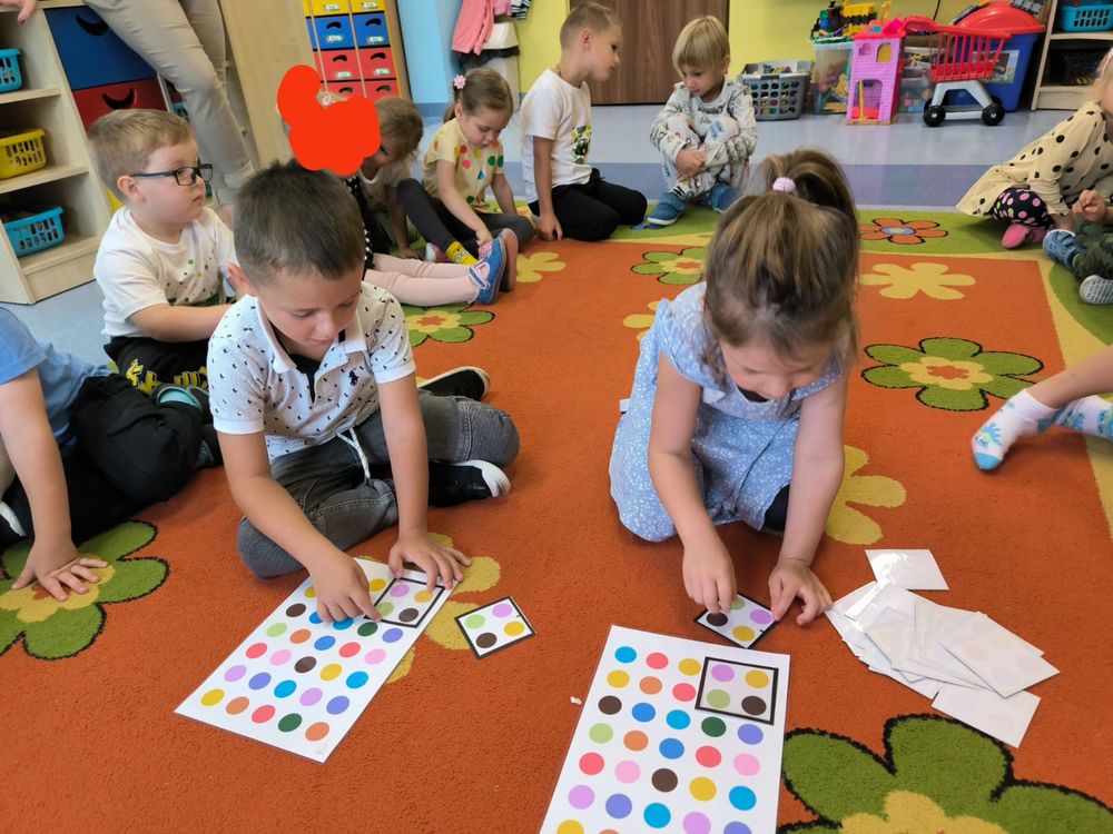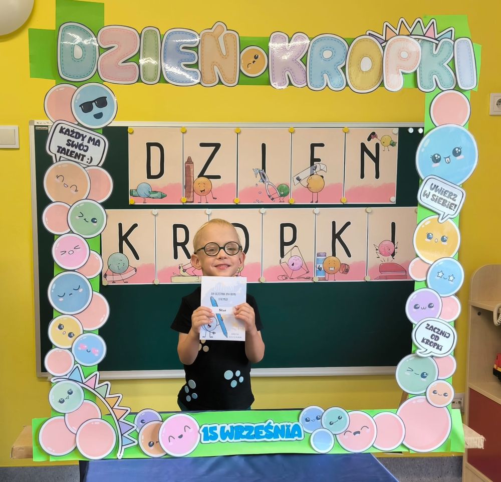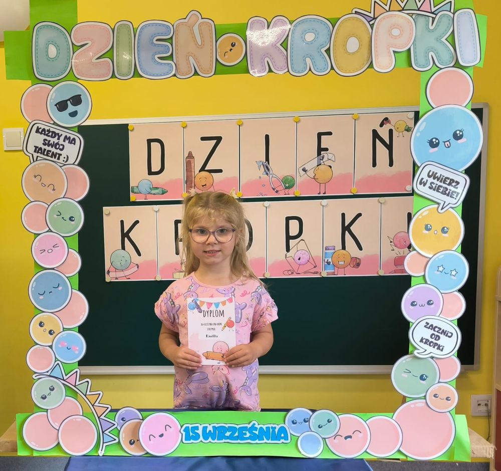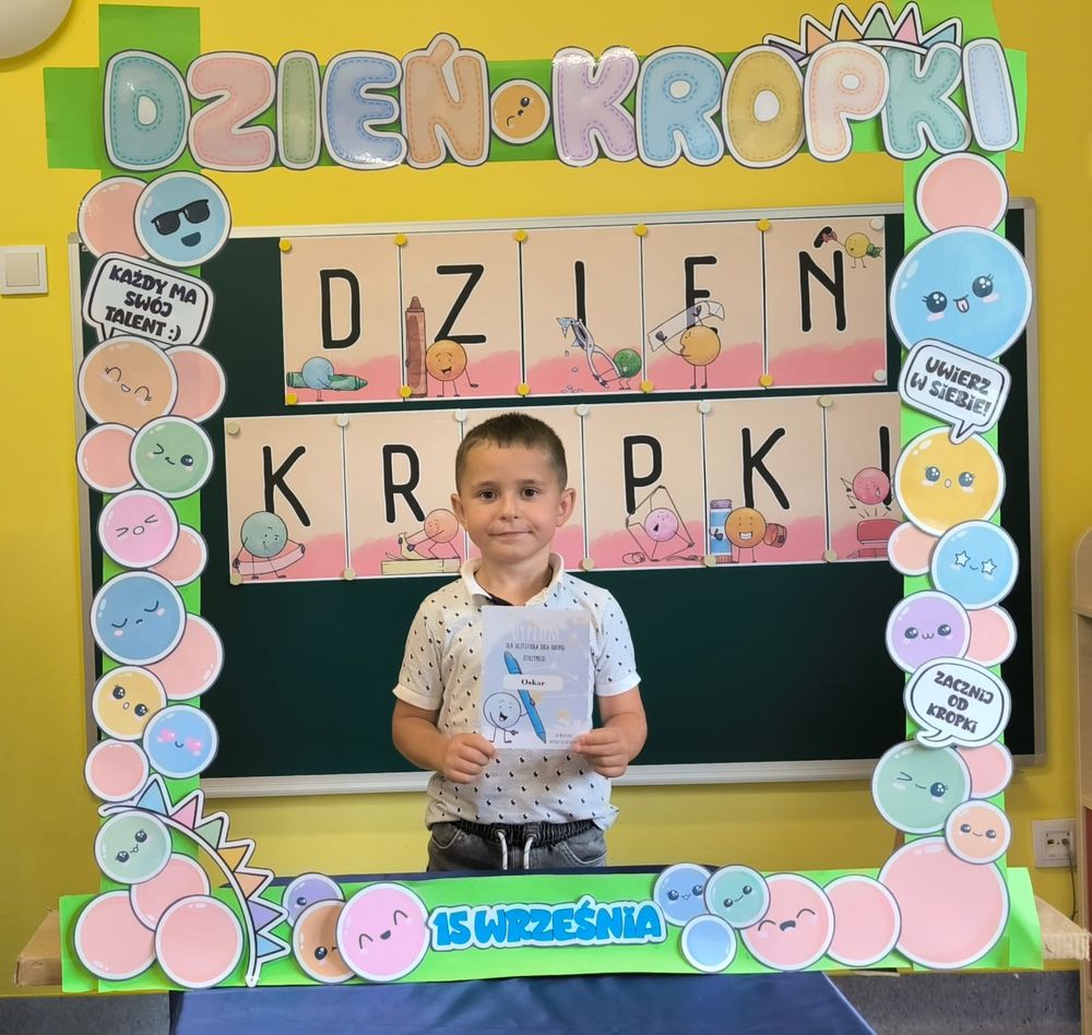 16 września dzieci z grupy Biedronek obchodziły Dzień Kropki. W trakcie zajęć poznały historię dziewczynki, która odkryła swój talent i odzyskała wiarę we własne możliwości. Na dzieci czekały różnorodne zadania: musiały odnaleźć cień pasujący do ilustracji oraz ćwiczyć swoją spostrzegawczość. Biedronki utrwalały także nazwy kolorów podczas wspólnej pracy plastycznej. Dodatkowo rozwijały swoją sprawność ruchową podczas zabawy z kolorowymi krążkami. Z wszystkimi zadaniami poradziły sobie doskonale. Na zakończenie zajęć, przedszkolaki miały wykonane zdjęcia oraz otrzymały pamiątkowy dyplom.