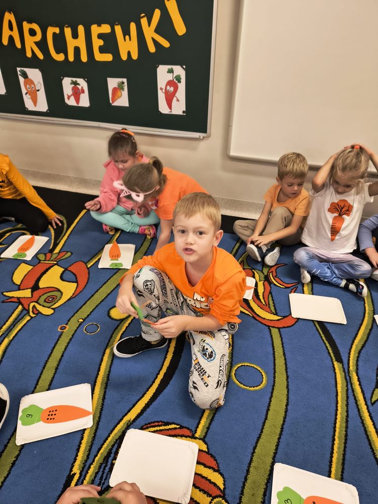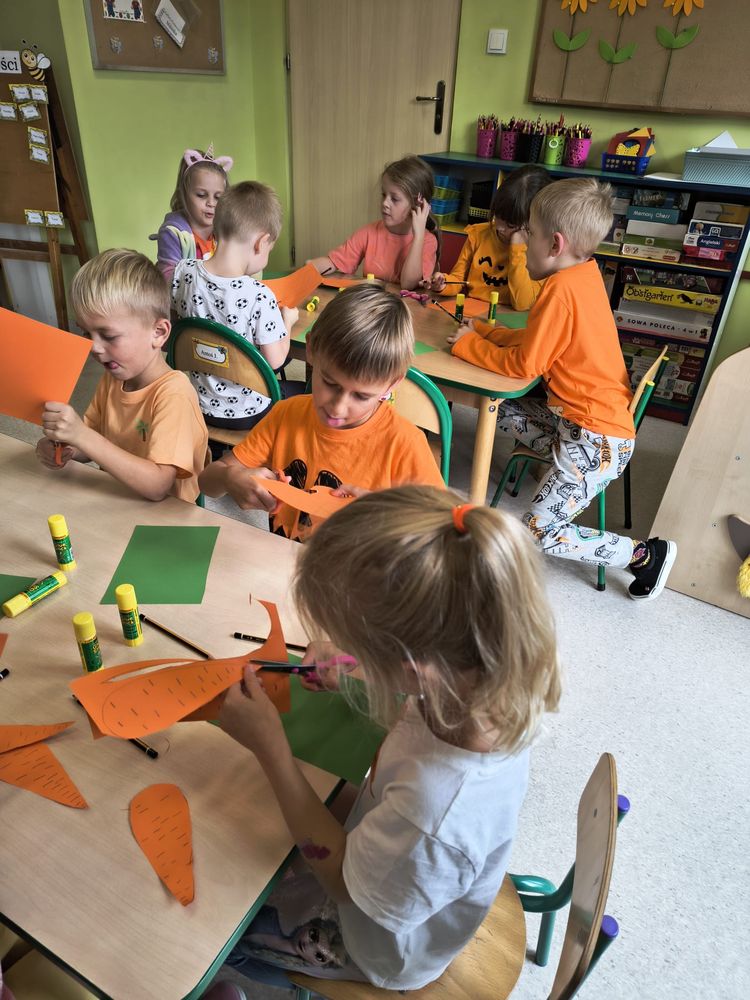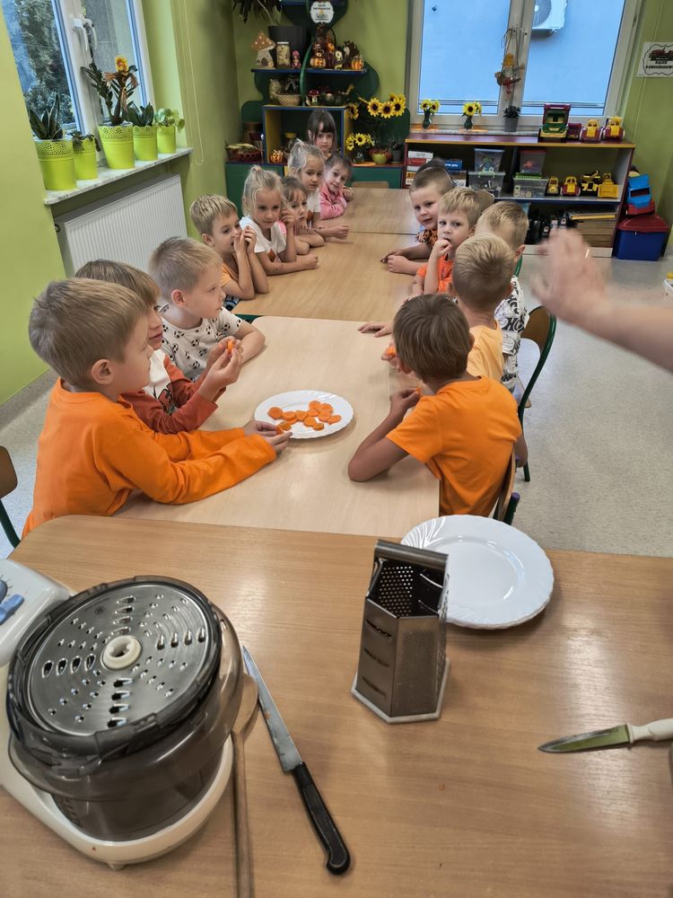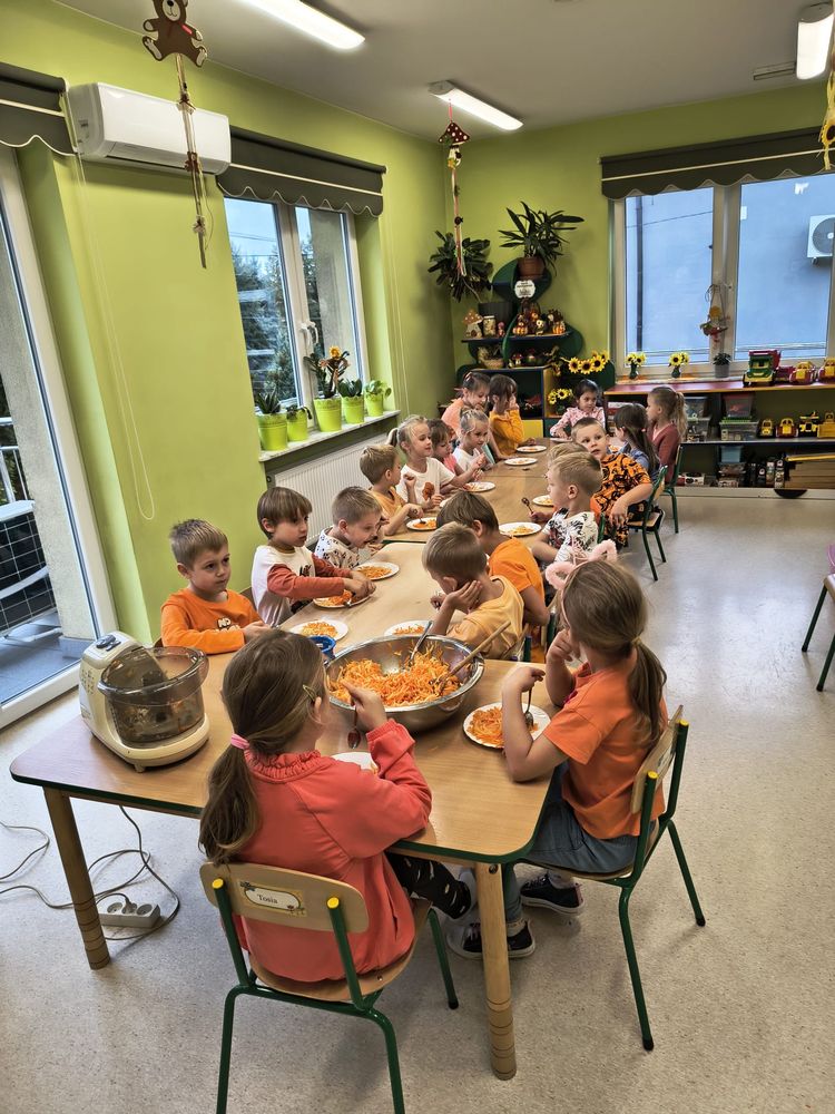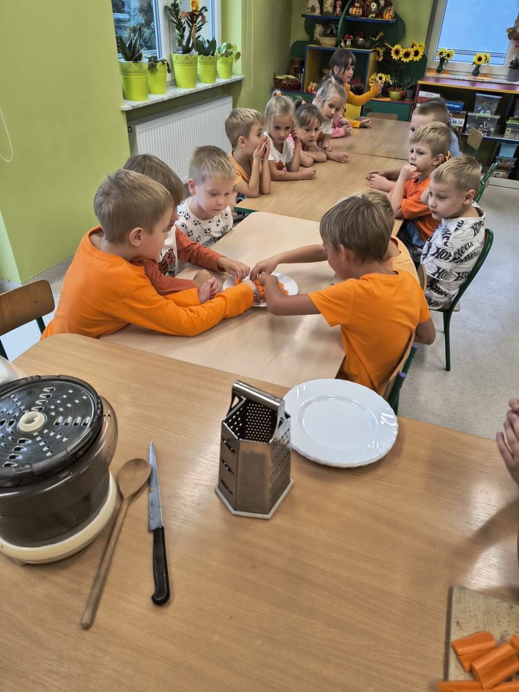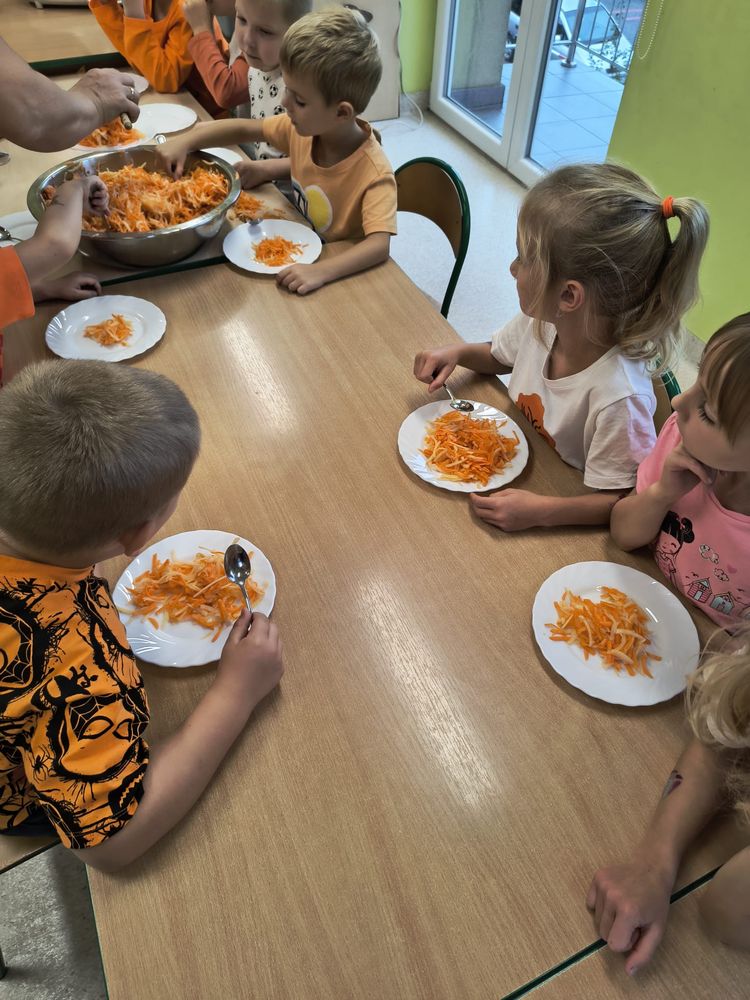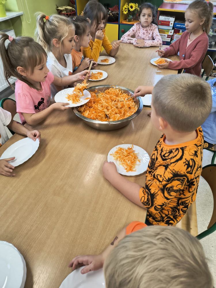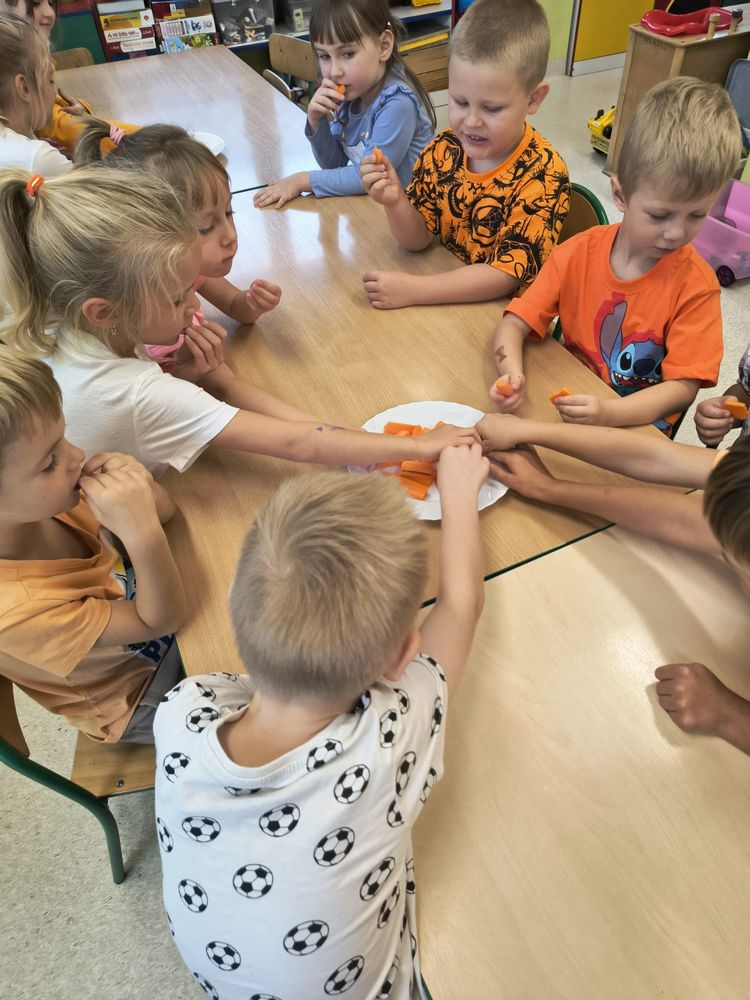 ,,Pszczółki” uczestnicząc w zajęciach związanych z tą tematyką obchodziły DZIEŃ MARCHEWKI. W tym dniu dominującym kolorem był kolor pomarańczowy, a bohaterem zadań do wykonania była marchewka. Przedszkolaki układały puzzle, przeliczały elementy, wycinały i kleiły. Wykonały też przepyszną surówkę marchewkowo – jabłkową, którą podzieliły