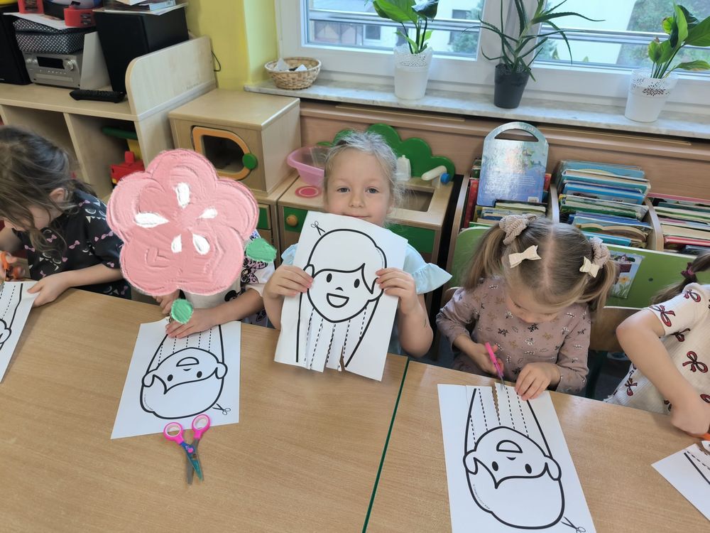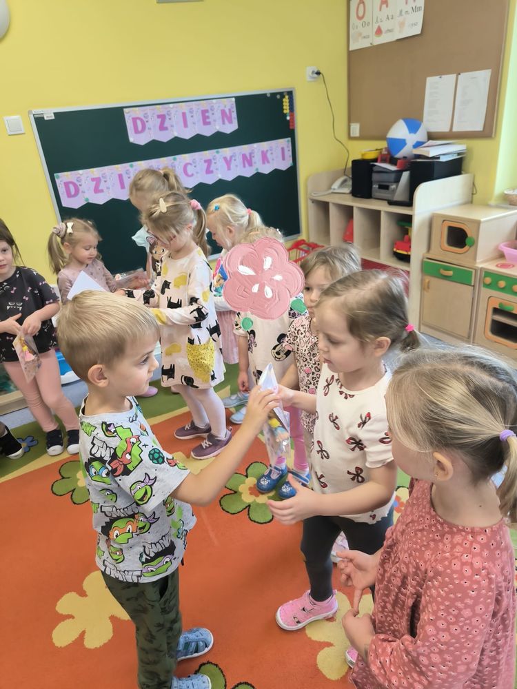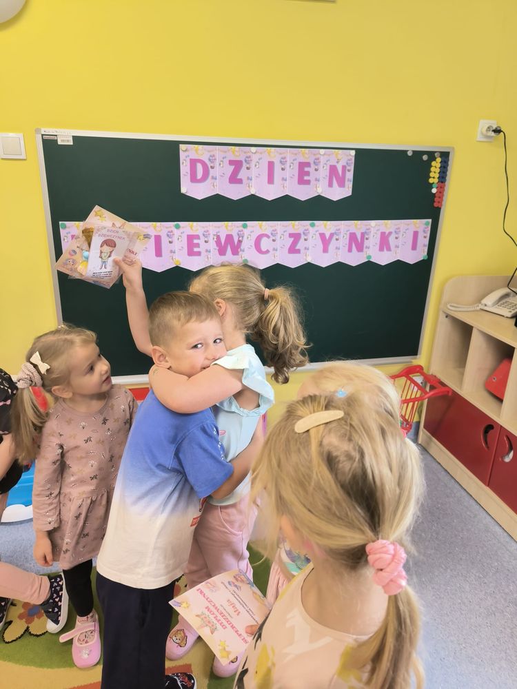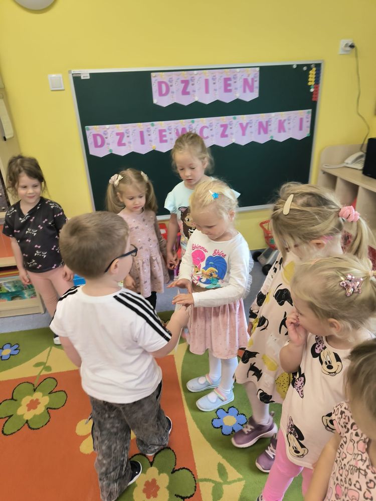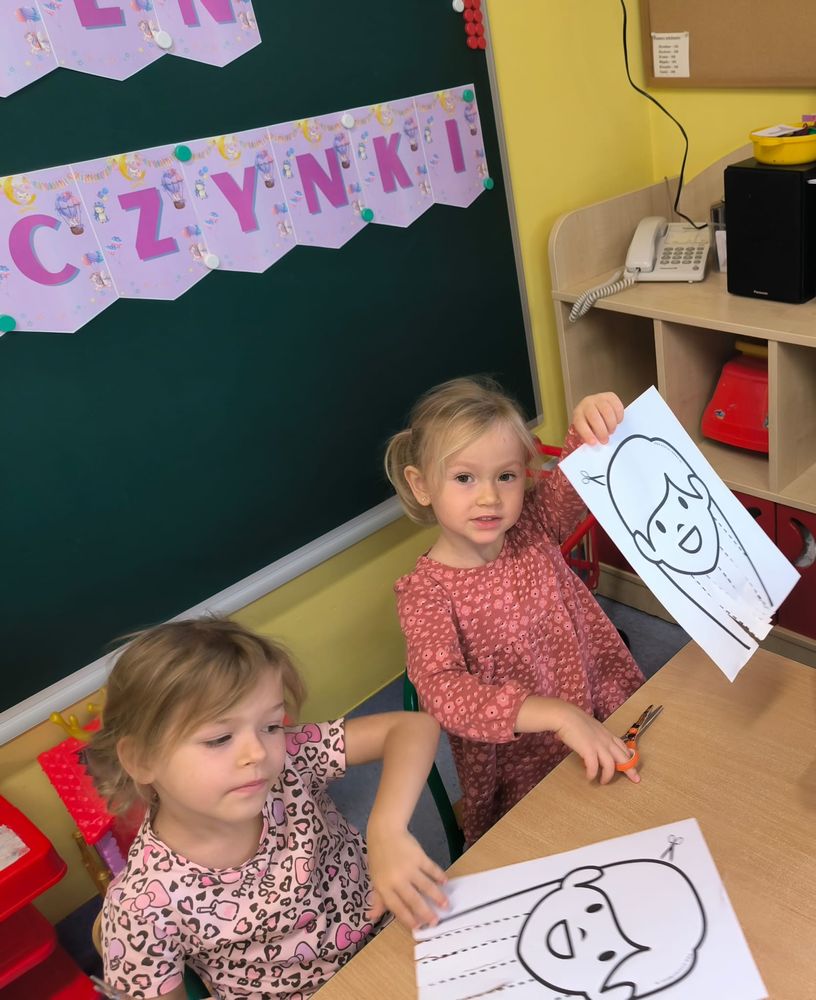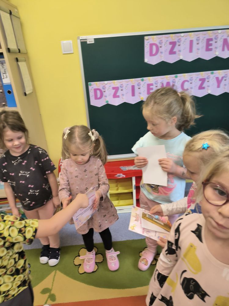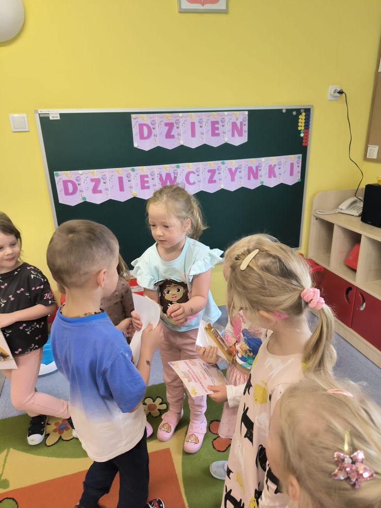 Podczas swojego święta dziewczynki świetnie się bawiły. Pierwszym zadaniem było pokonanie ścieżki sensorycznej, z którym doskonale sobie poradziły. Następnie nasze małe damy przystąpiły do zadań przy stoliku, doskonaląc swoje umiejętności wycinania nożyczkami, spostrzegawczość oraz sprawność manualną. Chłopcy bacznie obserwowali pracę dziewczyn i kibicowali im, a także musieli spełnić ich życzenia, wykonując wskazane ćwiczenia gimnastyczne Na zakończenie dziewczynki otrzymały pamiątkowy dyplom oraz upominek, który wręczyli im koledzy z grupy.