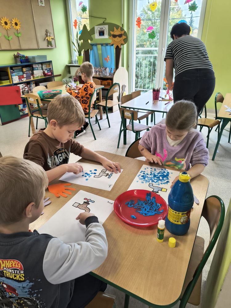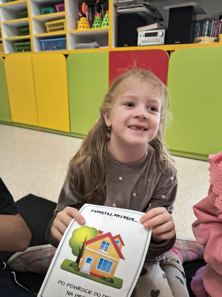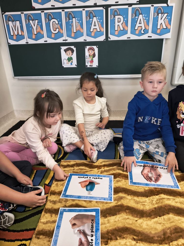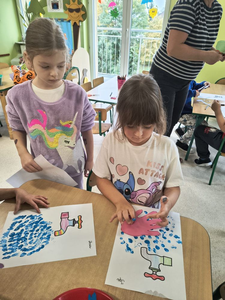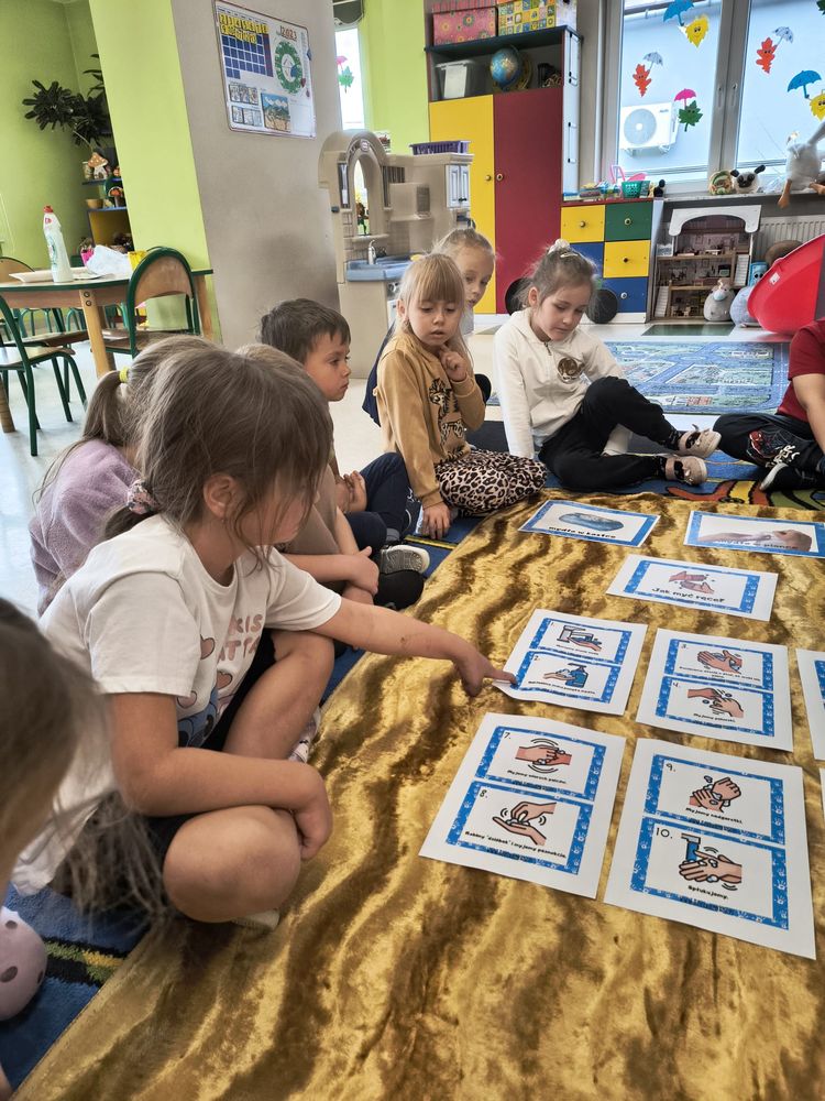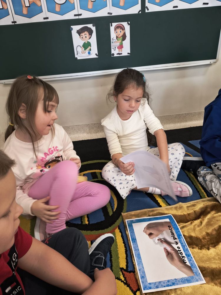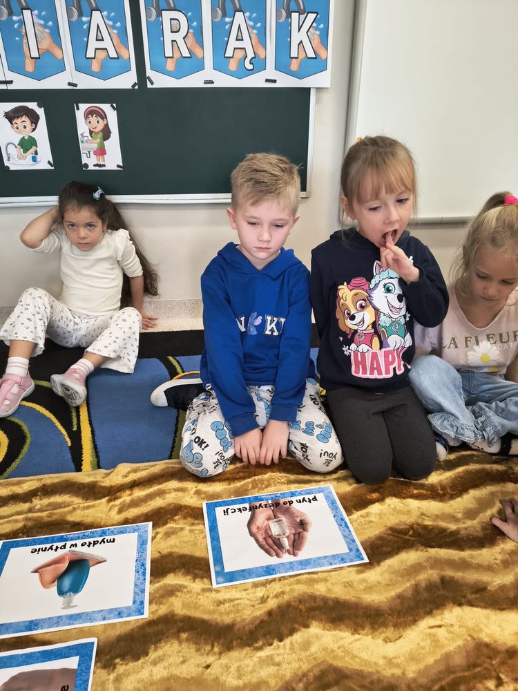 Z tej okazji została przeprowadzona pogadanka na temat tego, kiedy i jak prawidłowo myć ręce, oraz dlaczego jest to takie ważne dla naszego zdrowia. Dzieci dowiedziały się, jakie choroby mogą być spowodowane przez ,,brudne ręce” i jak można ich uniknąć. Przedszkolaki aktywnie uczestniczyły w rozmowie, chętnie odpowiadały na pytania i utrwalały etapy poprawnego mycia rąk. Zajęcia zakończyły się wykonaniem pracy plastycznej podsumowującej omawianą tematykę.