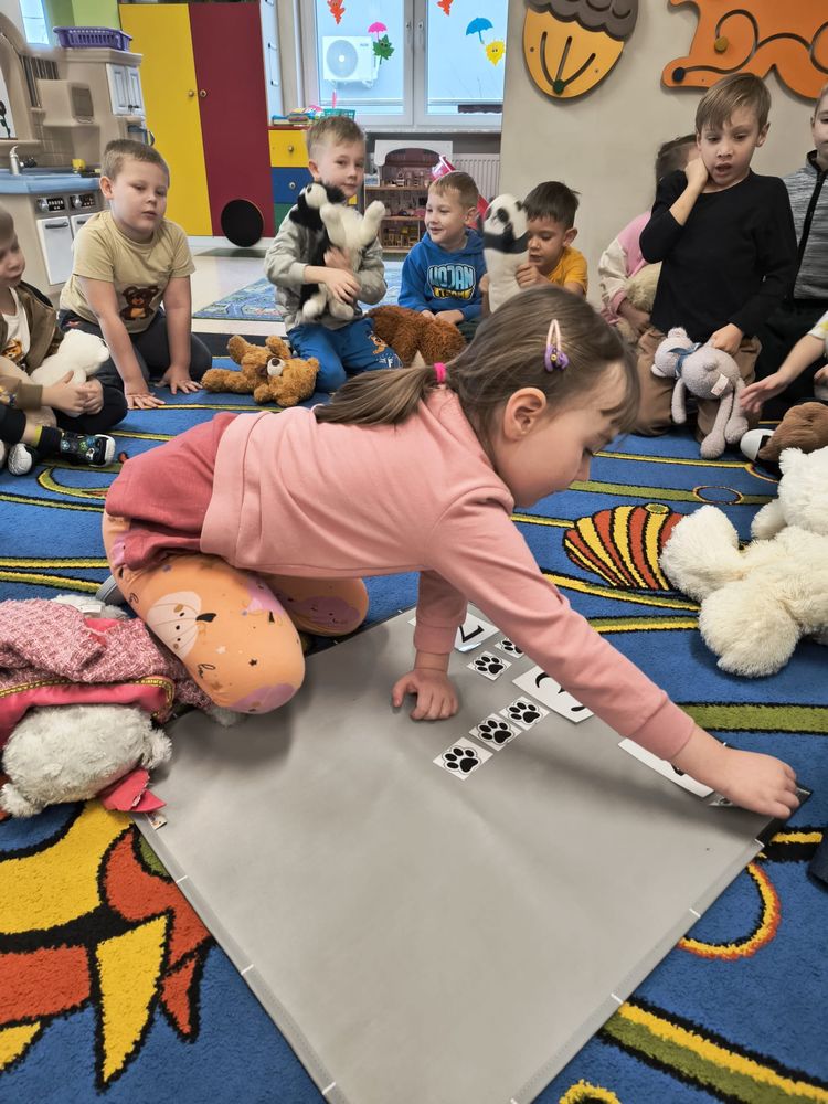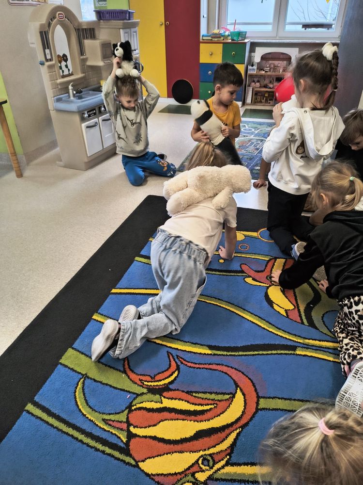 Nie zabrakło ruchu – dzieci z entuzjazmem wzięły udział w zabawie „Stary niedźwiedź mocno śpi” oraz w gimnastyce ze swoimi misiami, co sprawiło im ogromną radość.