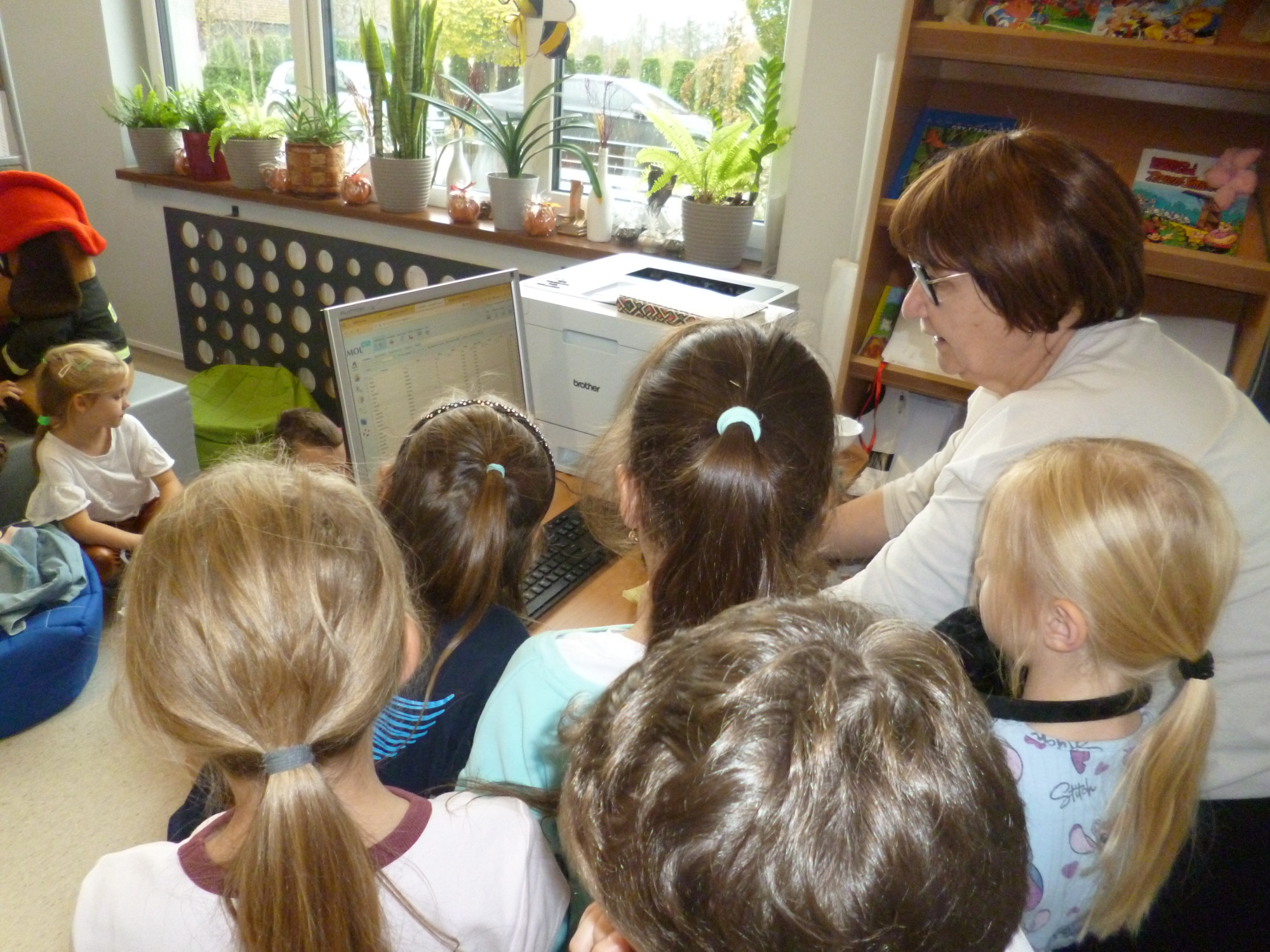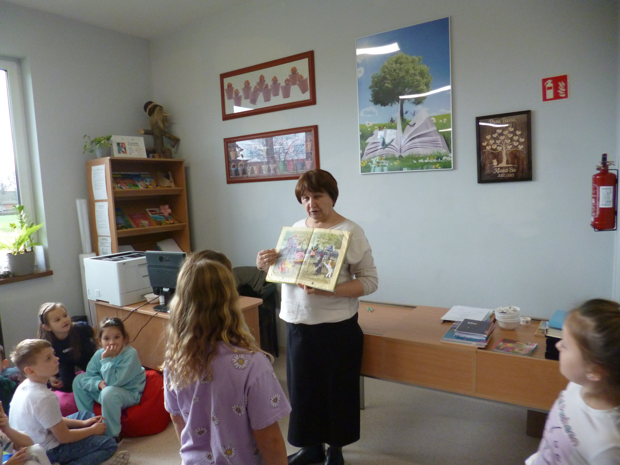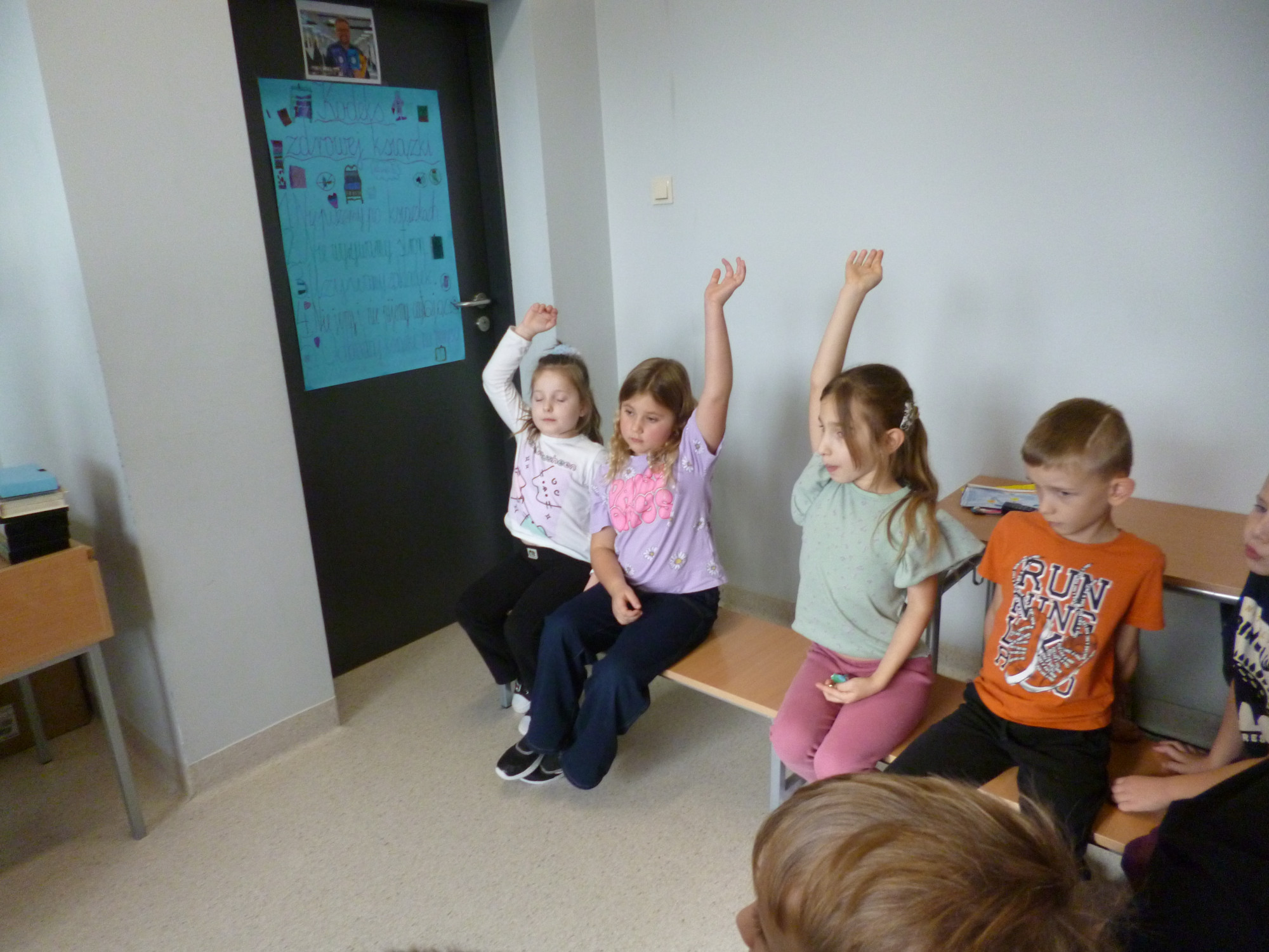 Dzieciaki chętnie odpowiadały na pytania pani bibliotekarki np. jakie książki czytają, czy warto czytać, czy często wypożyczają książki i czy lubią czytać. Spotkanie miało na celu przybliżenie najmłodszym roli biblioteki w życiu szkoły, zachęcenie do czytania książek oraz rozwijanie zainteresowań czytelniczych.