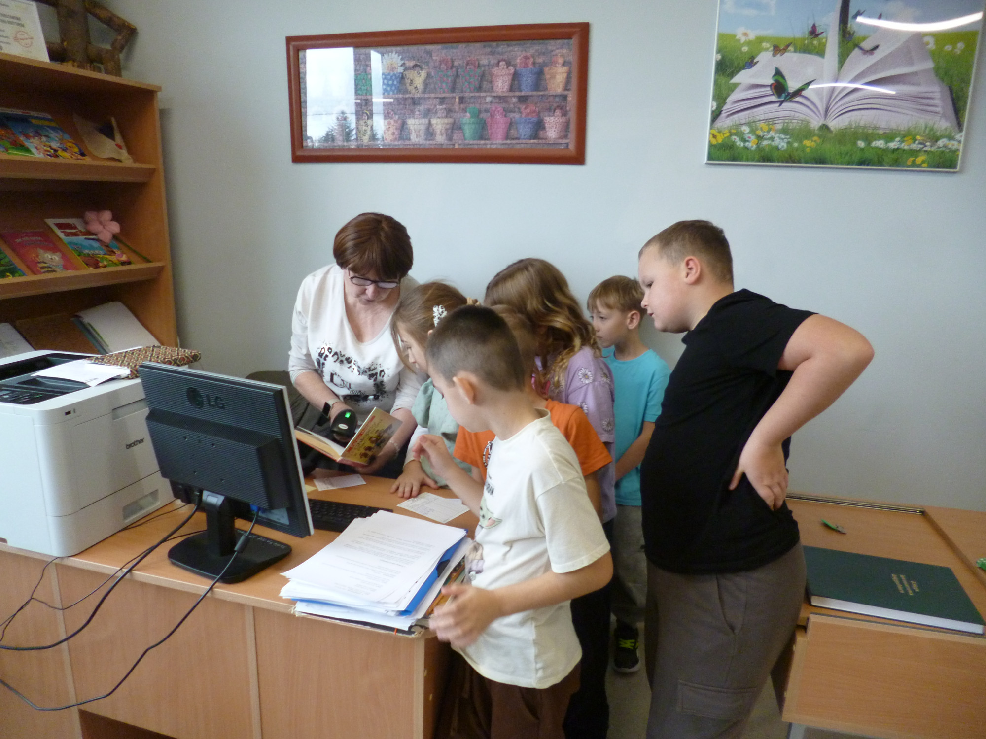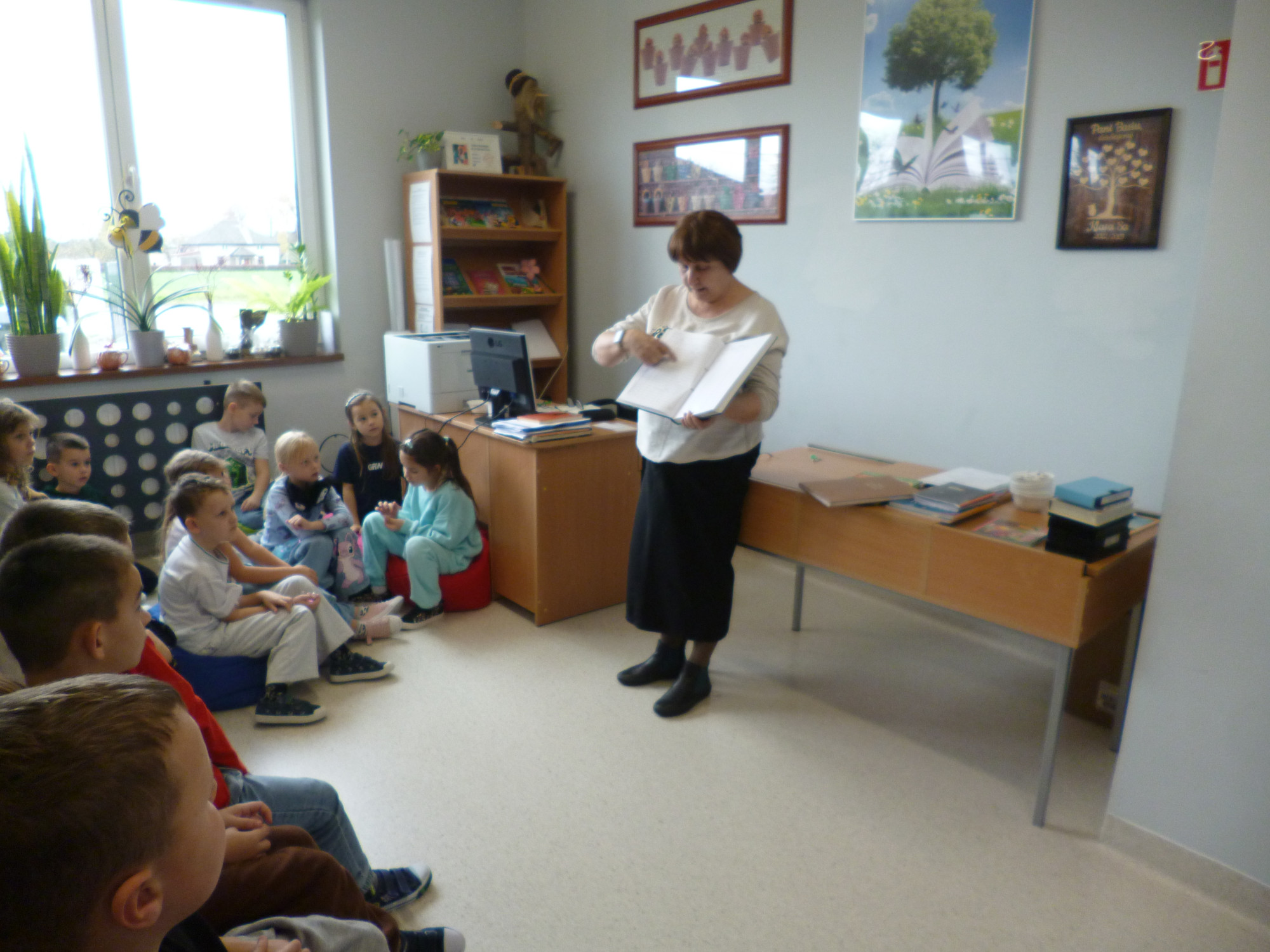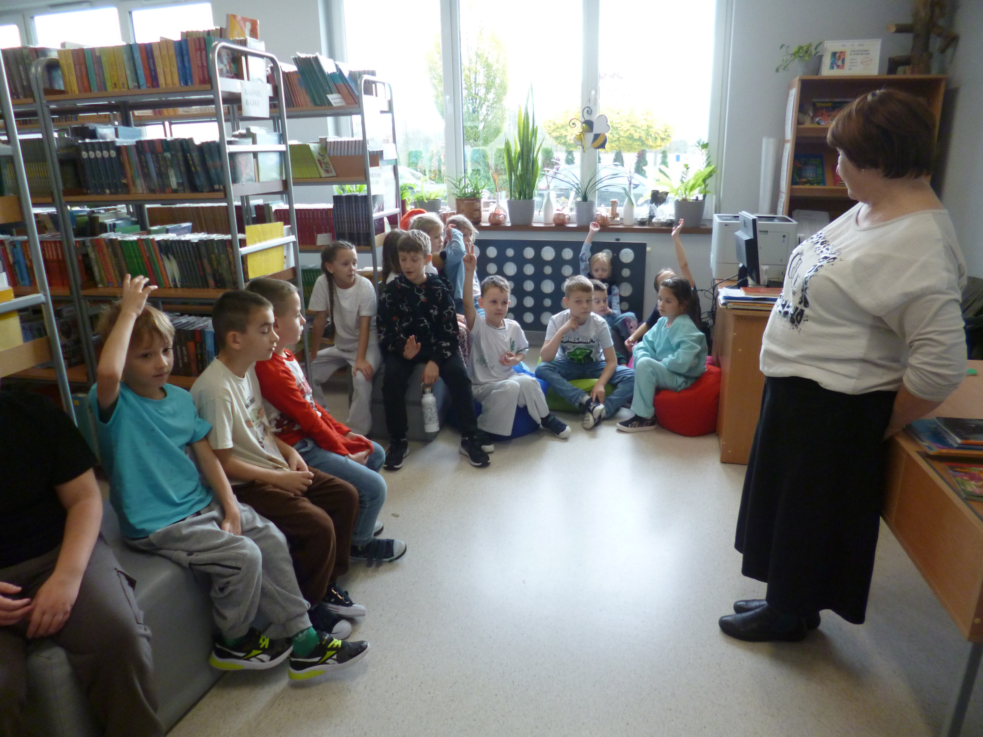 Dzieci ze świetlicy szkolnej w ramach Października Miesiąca Bibliotek Szkolnych również odwiedziły swoją szkolną bibliotekę, w której z uśmiechem powitała nas bibliotekarka pani Basia. Zajęcia rozpoczęły się od wprowadzenia, podczas którego pani bibliotekarka opowiedziała dzieciom o tym, czym jest biblioteka, jak można z niej korzystać, jak powstała książka, jak należy obchodzić się z książkami i jakie rodzaje książek można wypożyczyć w bibliotece. Uczniowie dowiedzieli się także, w jaki sposób mogą zapisać się do biblioteki i jakie zasady obowiązują przy wypożyczaniu książek.