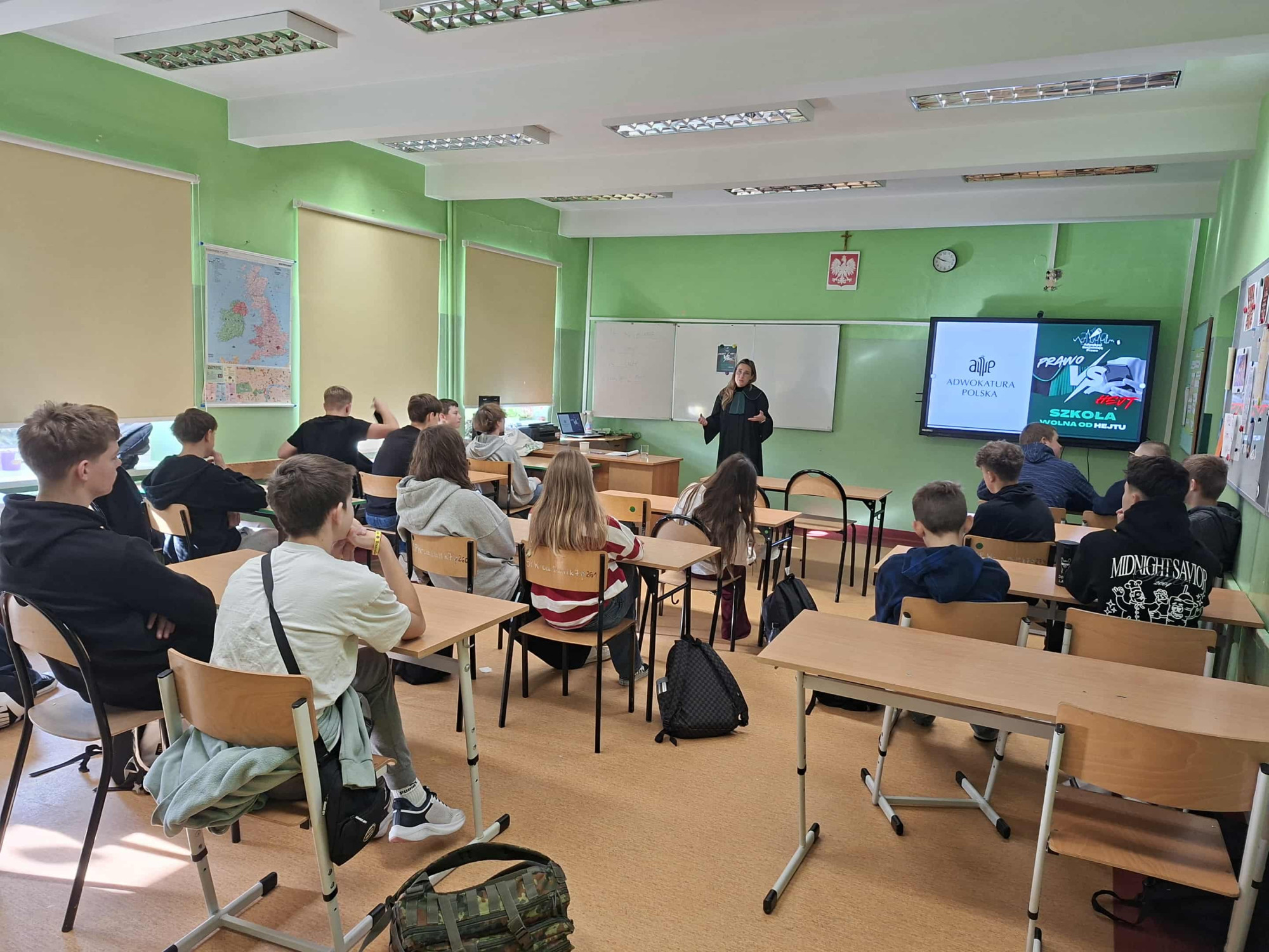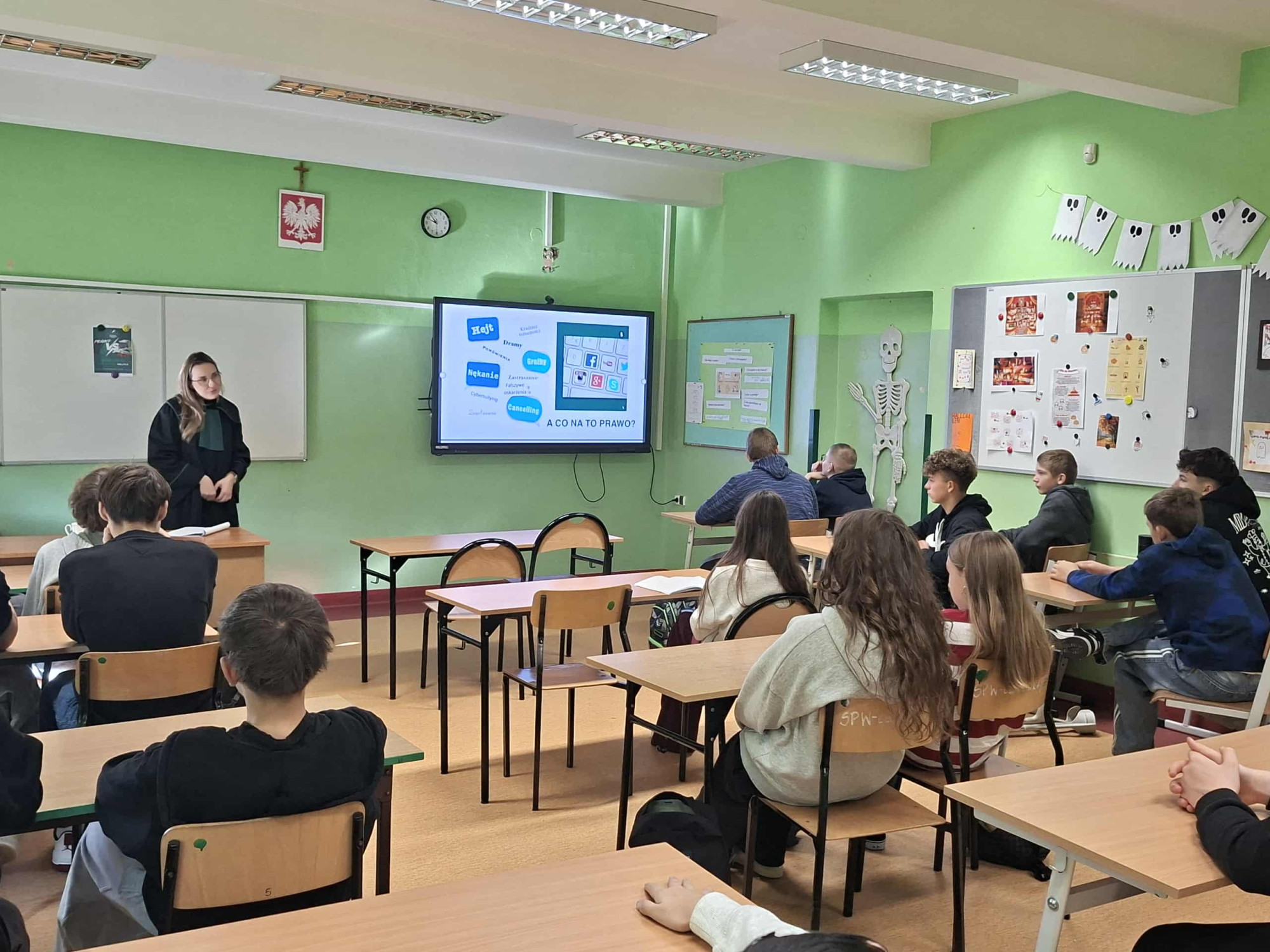 22.10.2025, Kategoria: Edukacja W dniu dzisiejszy uczniowie klas VII-VIII wzięli udział w ogólnopolskiej akcji edukacyjnej pt. "Adwokaci rozjaśniają prawo". Naszym gościem była pani adwokat Olga Możdżeń - Wielgosz, która w bardzo ciekawy i angażujący uczniów sposób omówiła temat hejtu w świetle prawa. Rozmowy z uczniami dotyczyły zjawiska hejtu w Internecie i w życiu codziennym oraz jego konsekwencji prawnych. To była bardzo wartościowa i ważna lekcja.