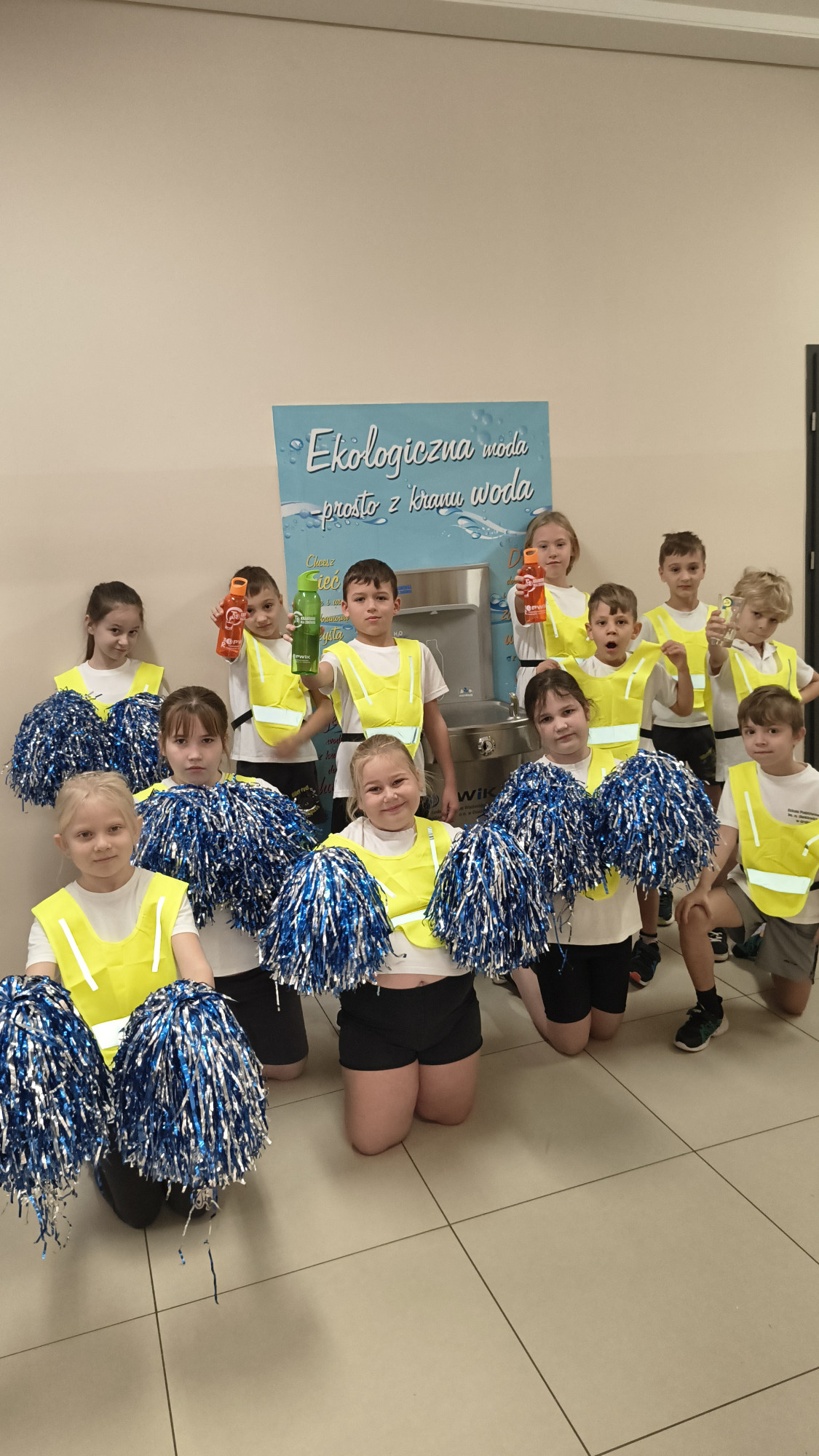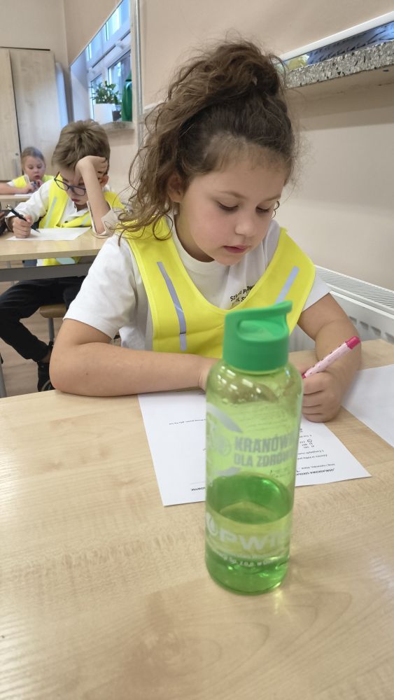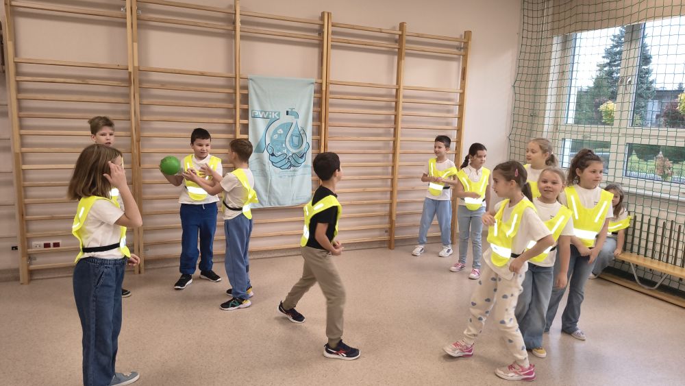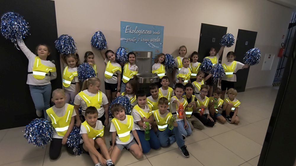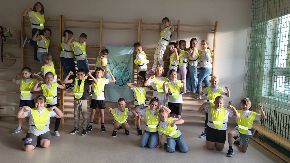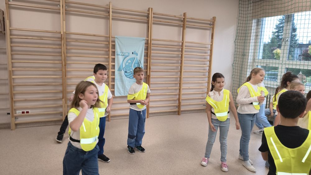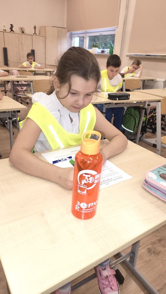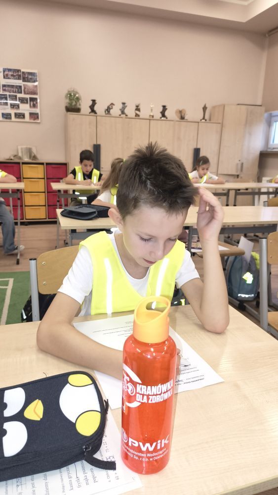 Uczniowie klas drugich dziś także mocno błyszczeli podczas zajęć, ponieważ otrzymali szelki odblaskowe, przekazane przez Przedsiębiorstwo Wodociągów i Kanalizacji w Oświęcimiu. Składamy serdeczne podziękowania Prezesowi Kazimierzowi Homa oraz Pracownikom PWiK za okazaną nam życzliwość i zrozumienie działań na rzecz poprawy bezpieczeństwa naszych uczniów. Po rozgrywkach sportowych drugoklasiści chętnie skorzystali z poidełka wody pitnej zamontowanego na korytarzu szkolnym. Oświęcimskie Wodociągi dbają od lat, by woda w poidełku była zdrowa, bo woda to skarb najcenniejszy. „Kranówka dla zdrówka” przydała się także podczas pisania testu wiedzy o bezpieczeństwie w ruchu drogowym.